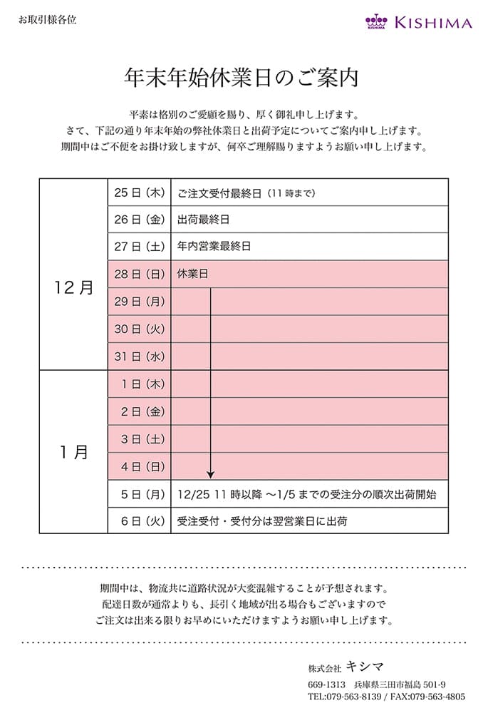 年末年始休業日のご案内